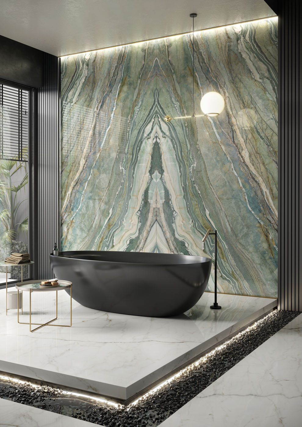 Verde France MB15,Calacatta Lincoln MB07, and Milan Stone SE03 flooring[/caption]
