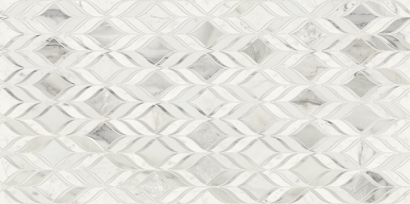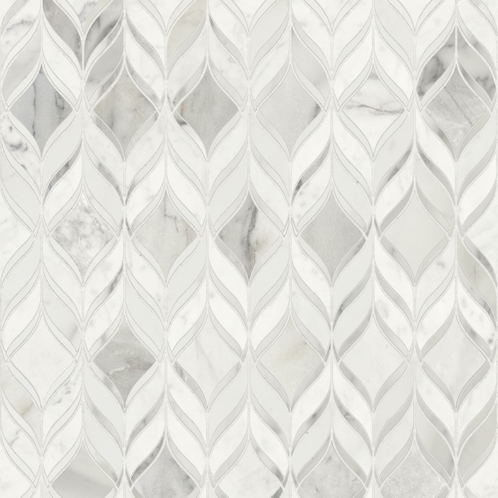 Crisp, ethereal alabaster tones layered with cool, silver-grey veining flowing in a rhythmic leaf motif, mimicking the sharp precision of artisan water-jet stonework. The neutral, icy palette acts as a serene foundation, avoiding high contrast shifts for a more seamless aesthetic.