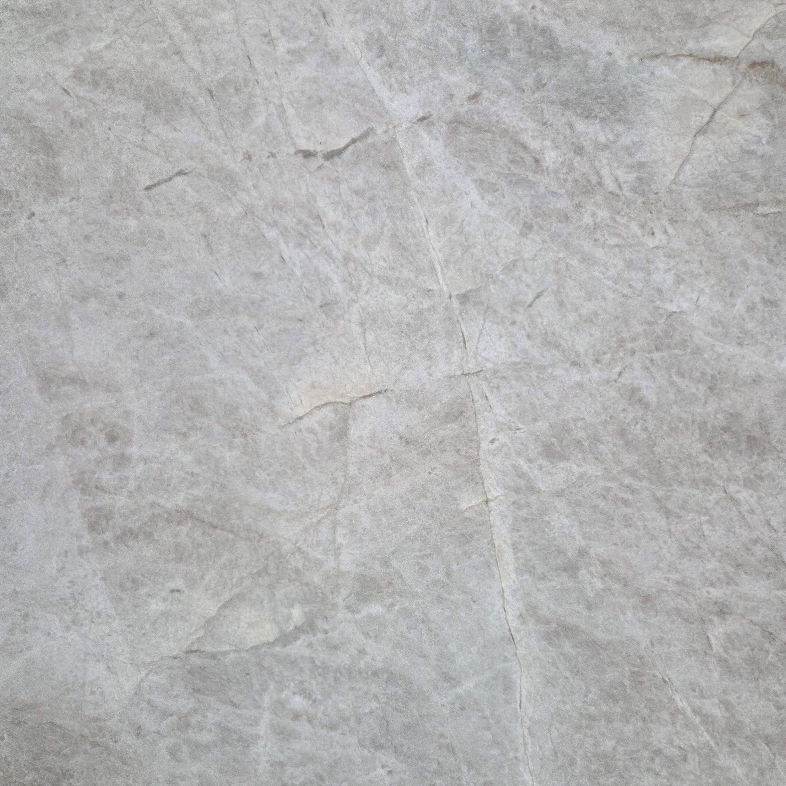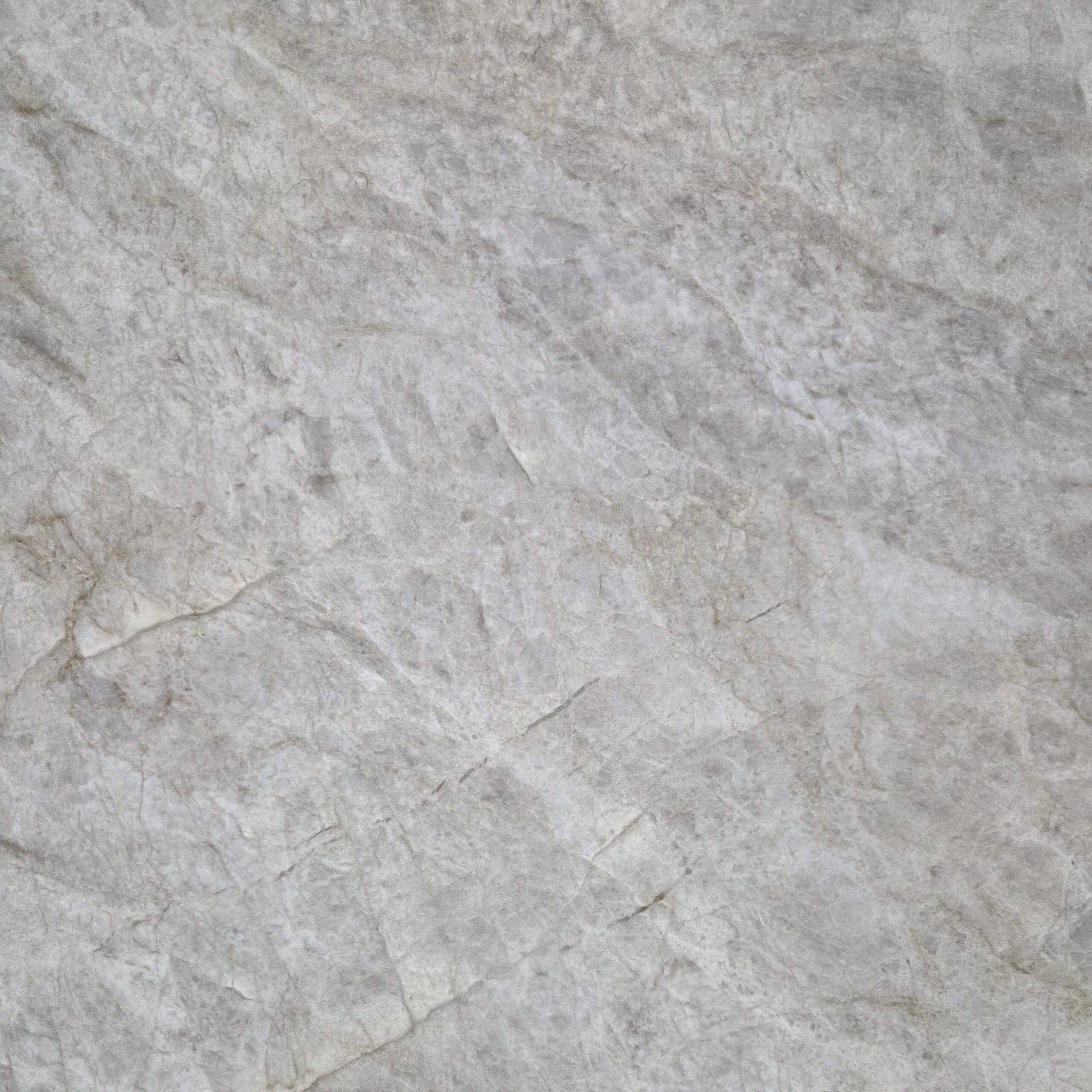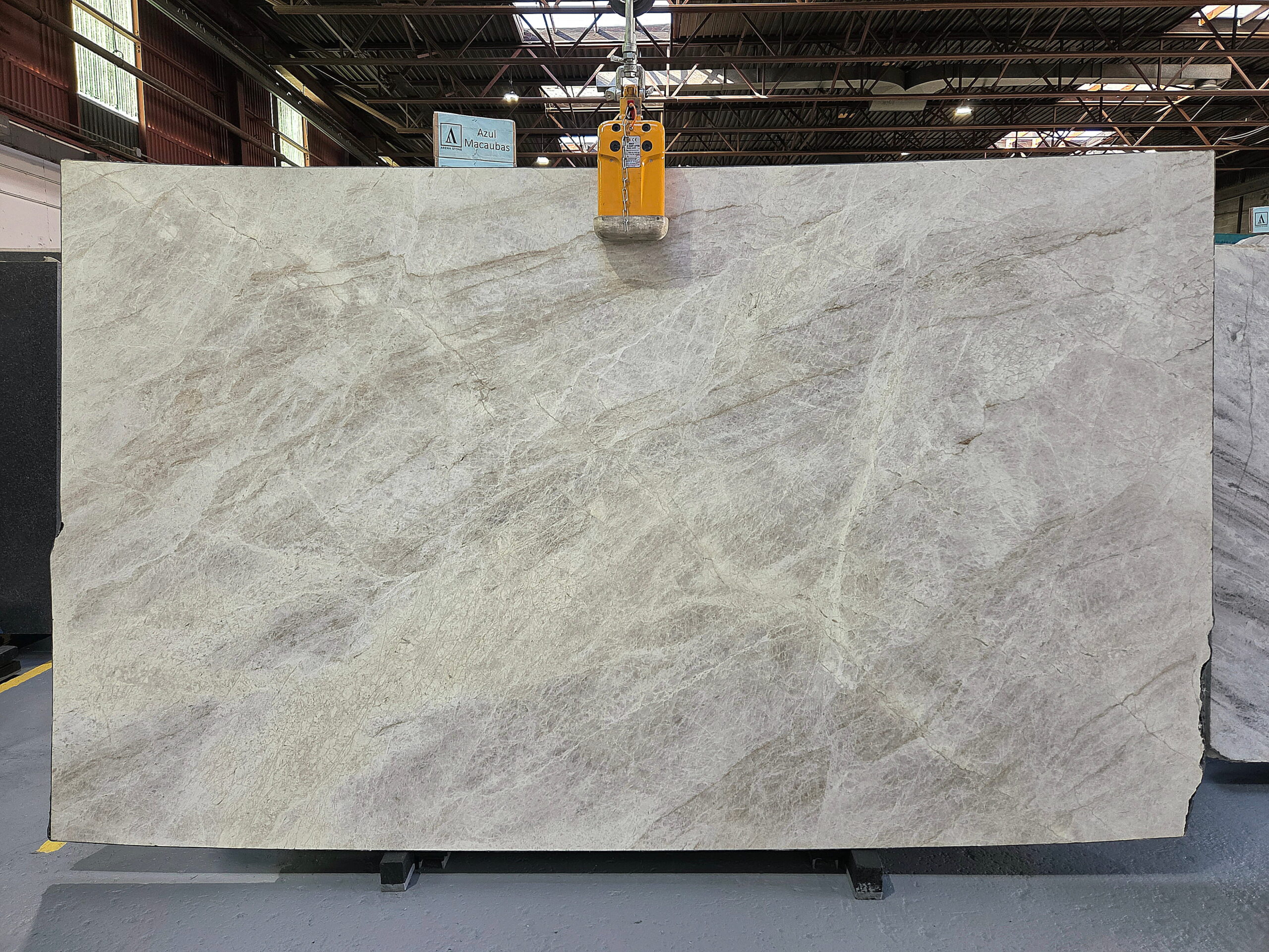 This stunning Taj Mahal quartzite slab showcases soft ivory and cream tones with flowing beige and taupe veining. Delicate swirling patterns create organic movement throughout, while subtle gold accents add warmth to this elegant natural stone.