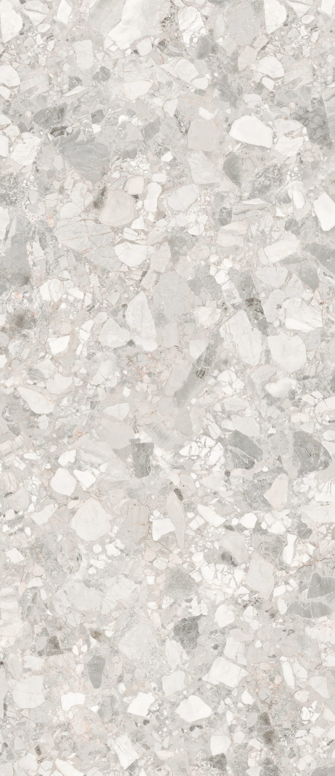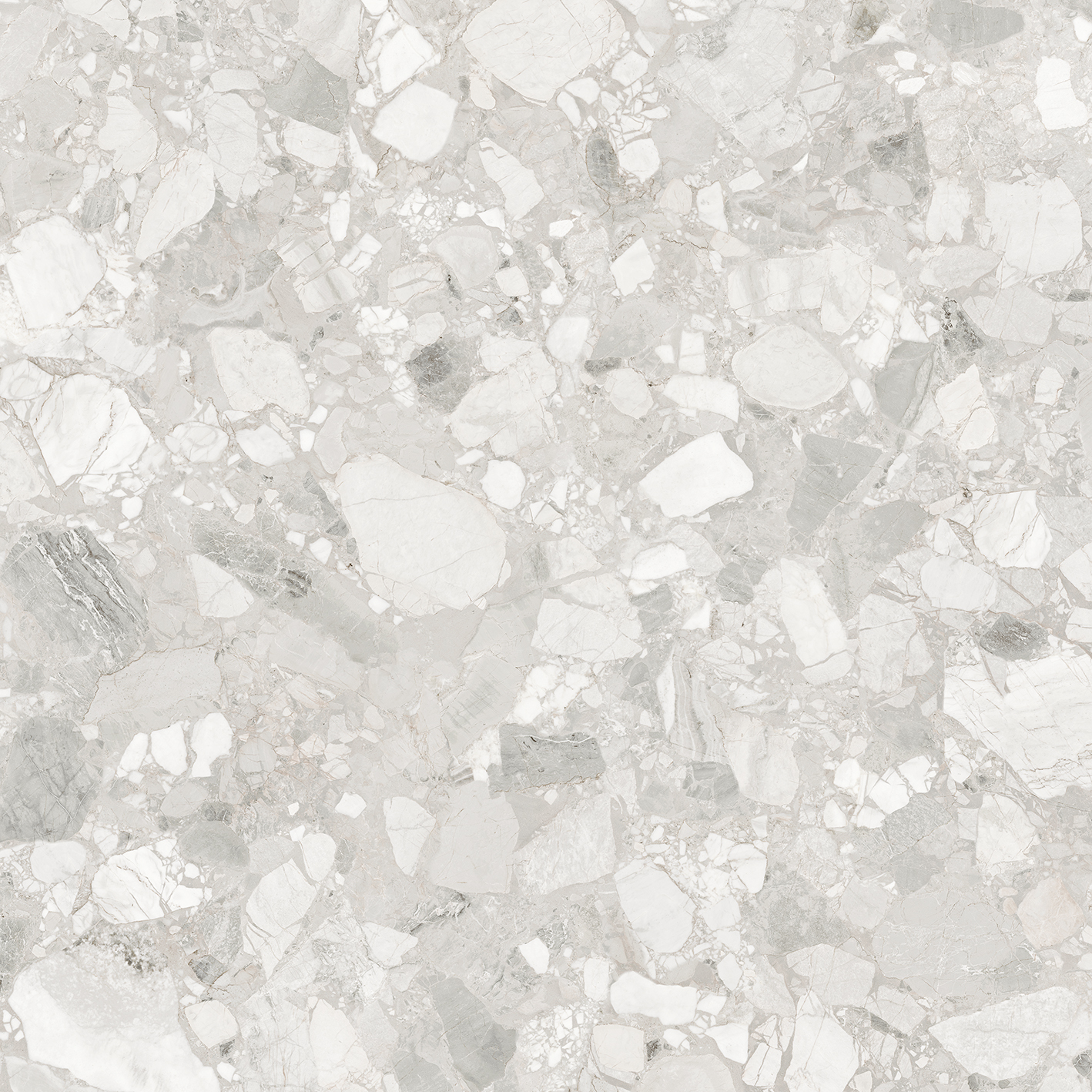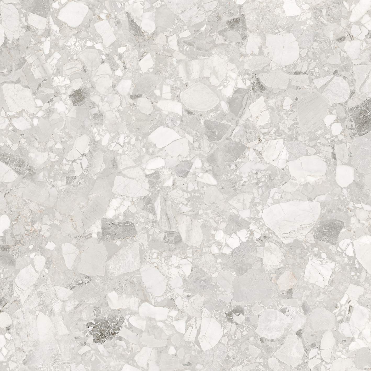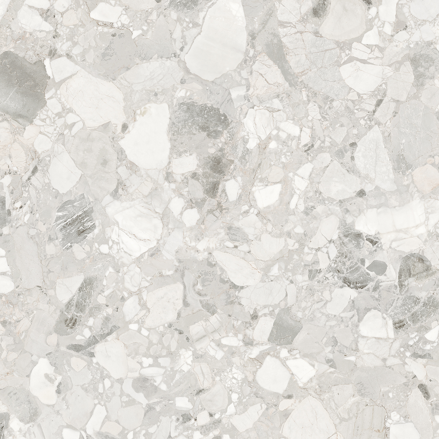 Visual interest meets contemporary elegance. Soft light base layered with an intricate mosaic of ivory, warm grey, and subtle stone fragments. The delicate terrazzo inspired contrast in colors creates a balanced, airy composition with gentle movement and depth.