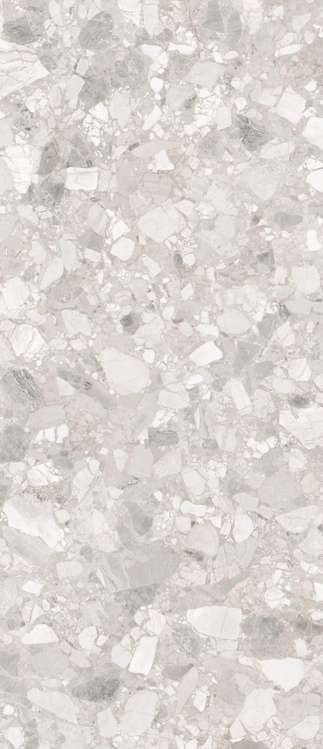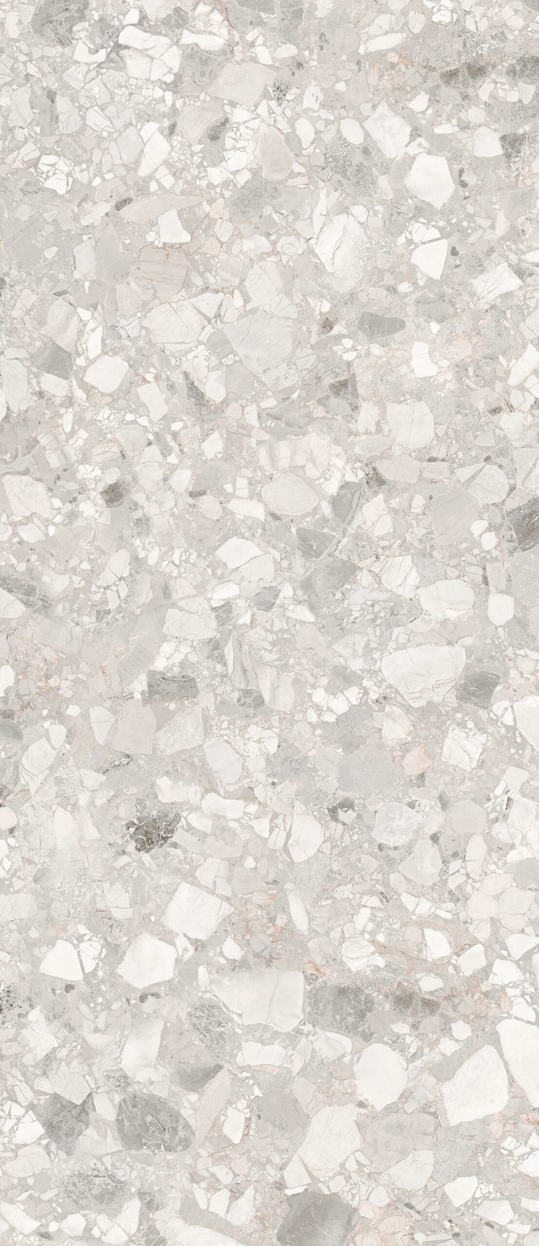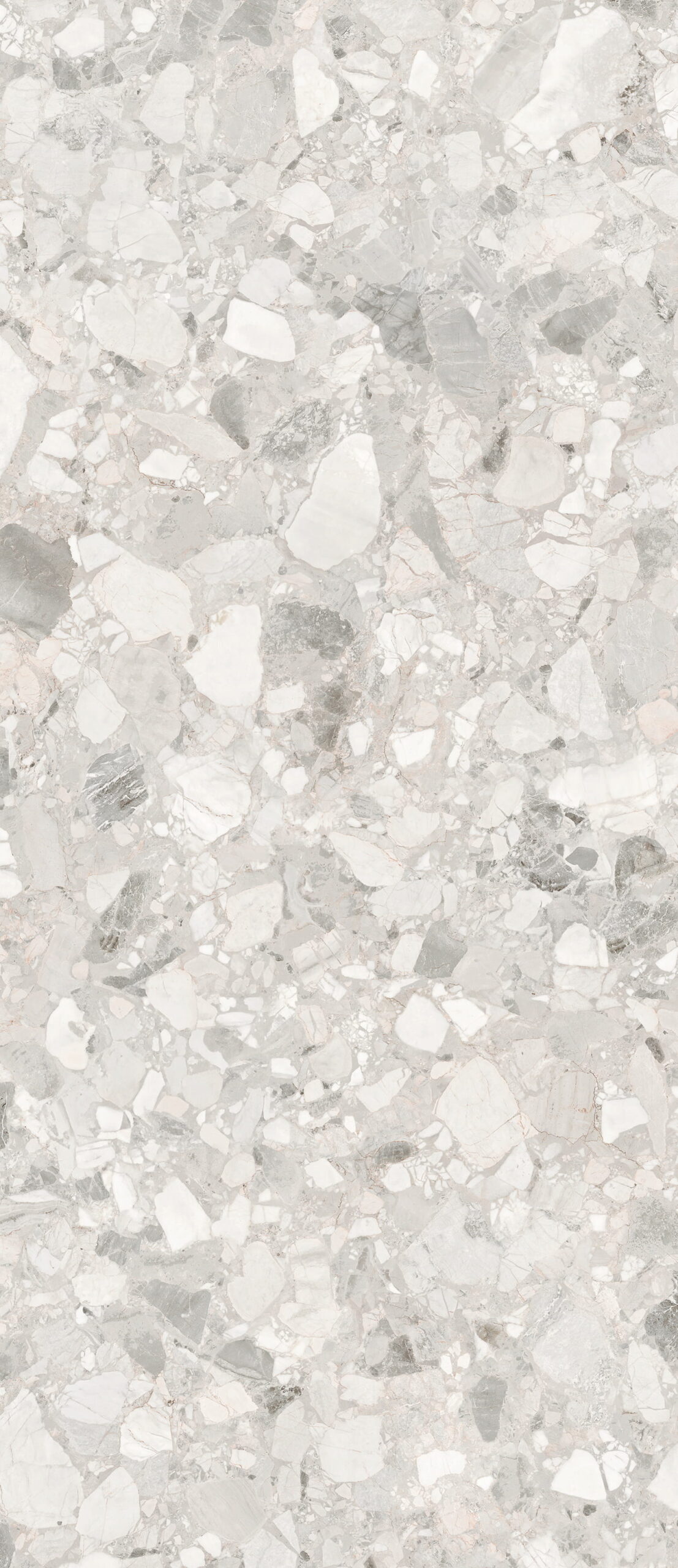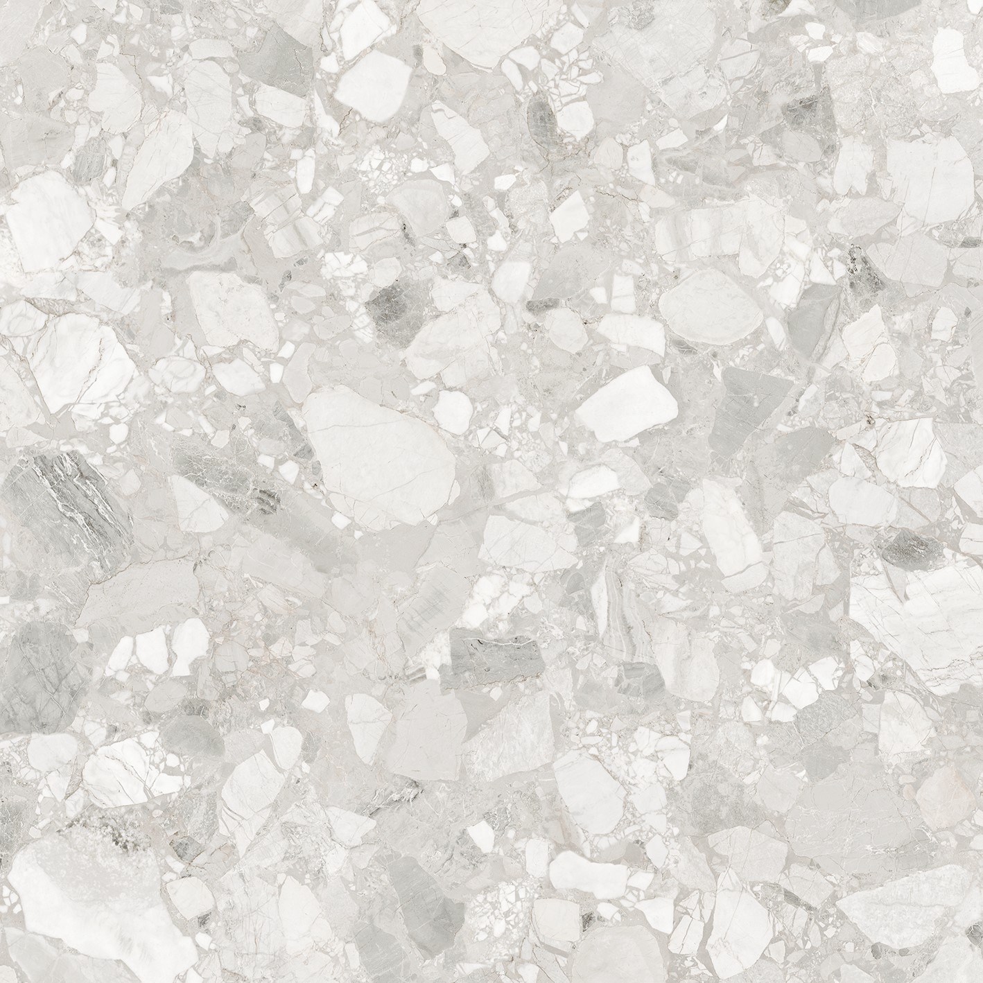 Visual interest meets contemporary elegance. Soft light base layered with an intricate mosaic of ivory, warm grey, and subtle stone fragments. The delicate terrazzo inspired contrast in colors creates a balanced, airy composition with gentle movement and depth.