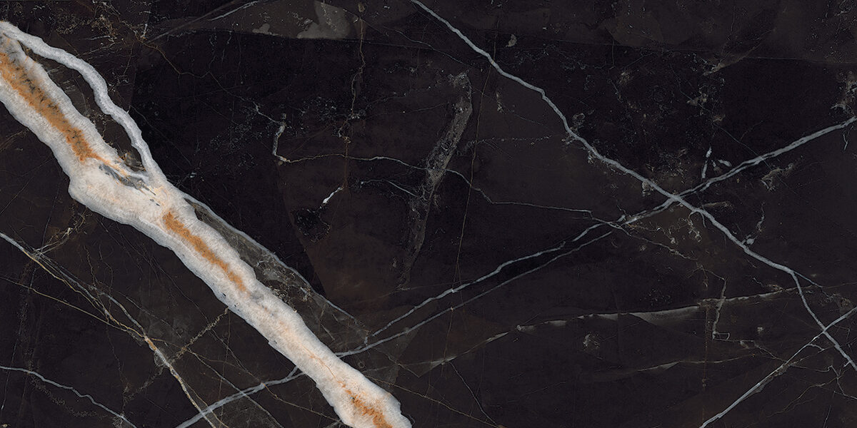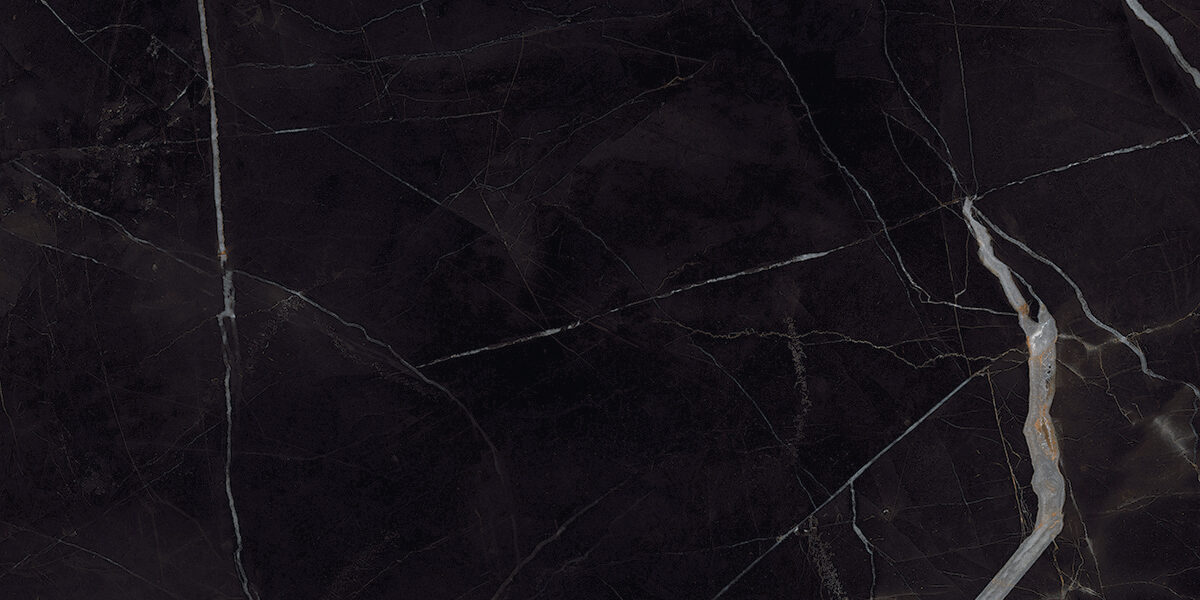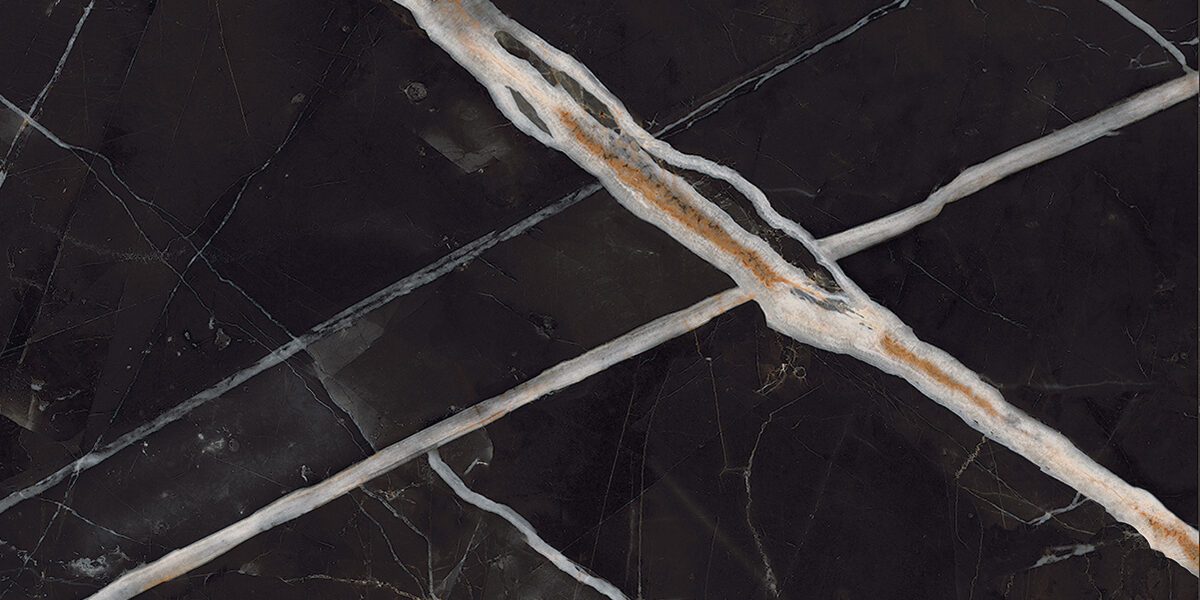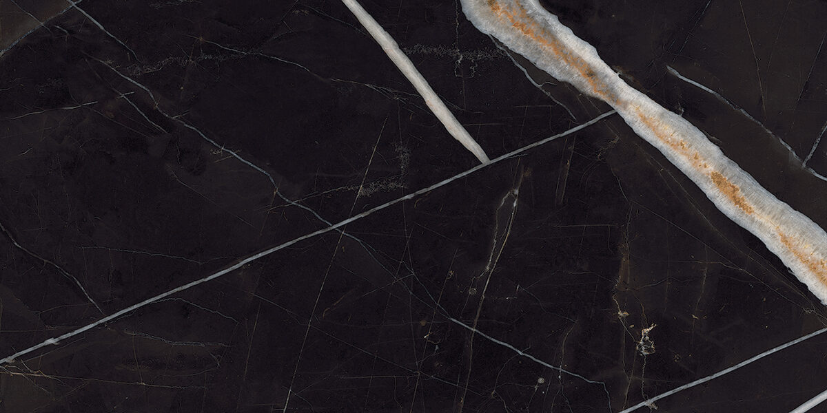 This striking selection showcases a bold black base enriched with dramatic, crisp white and soft gray veins that intersect the surface. It is accented by a vivid gold vein that cuts diagonally, adding warmth and contrast. The result is a luxurious design perfect for statement spaces.